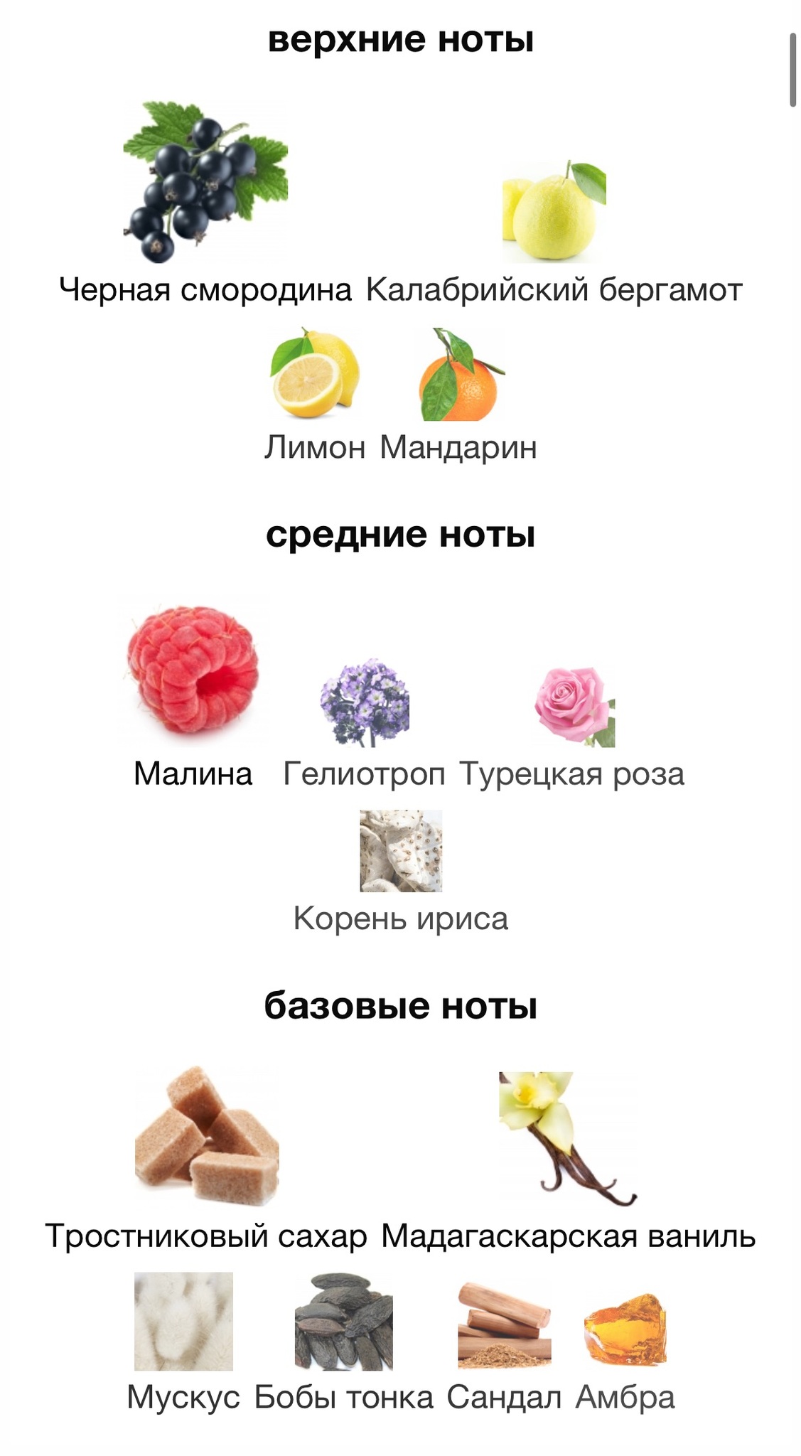 Верхние ноты: чёрная смородина, калабрийский бергамот, лимон и мандарин.