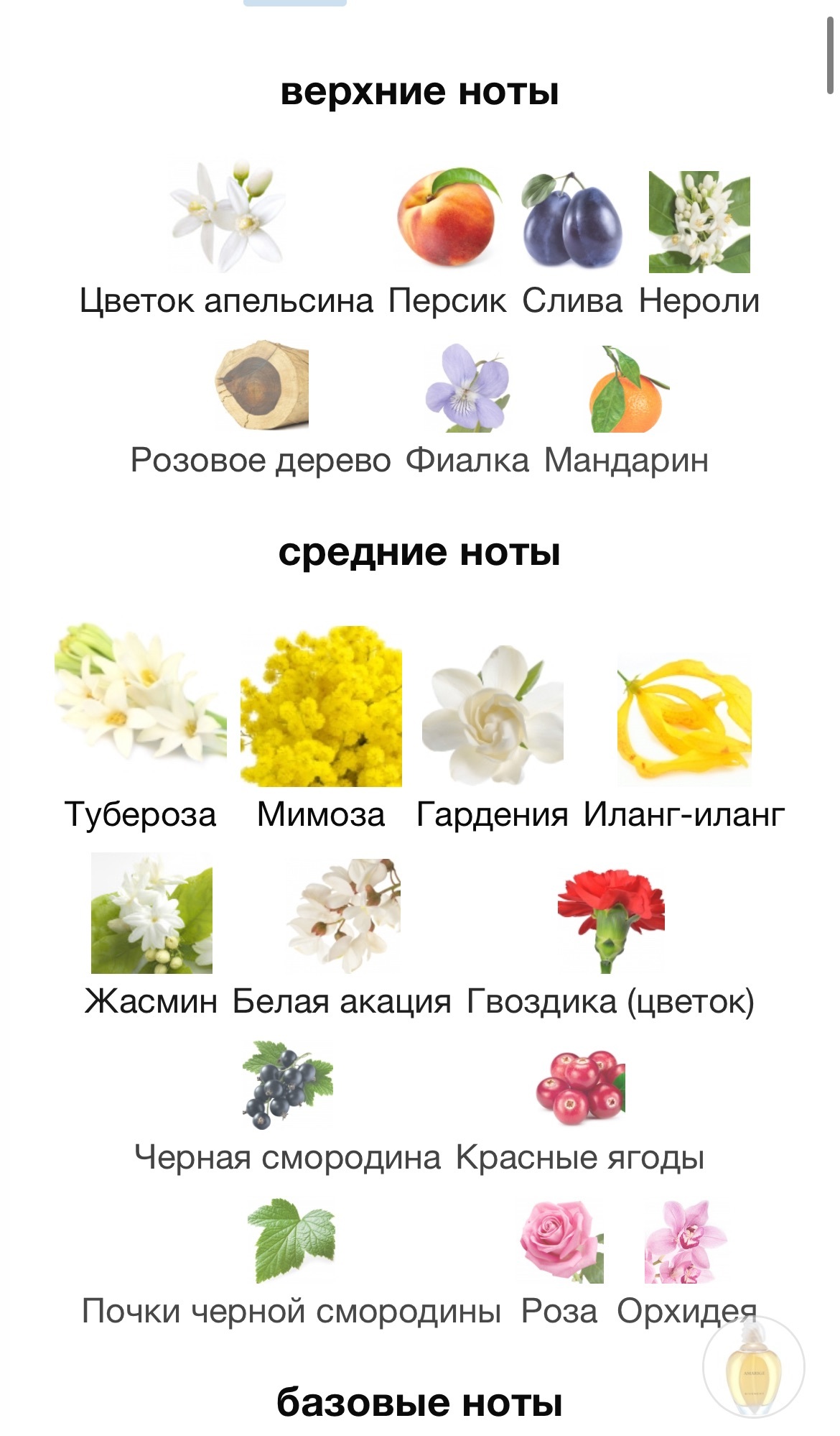 В верхних нотах аромата преобладают цветочные ноты фиалки и нероли, а также свежие фруктовые ноты мандарина, апельсина, сливы, цветка персика и палисандра.