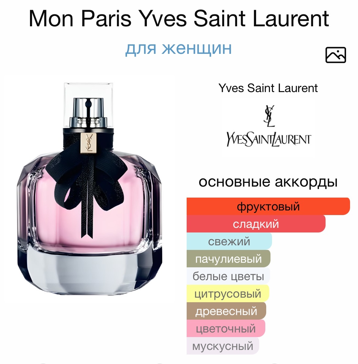 Yves Saint Laurent Mon Paris — это чувственный и романтичный аромат. Принадлежит к шипровой фруктовой группе.