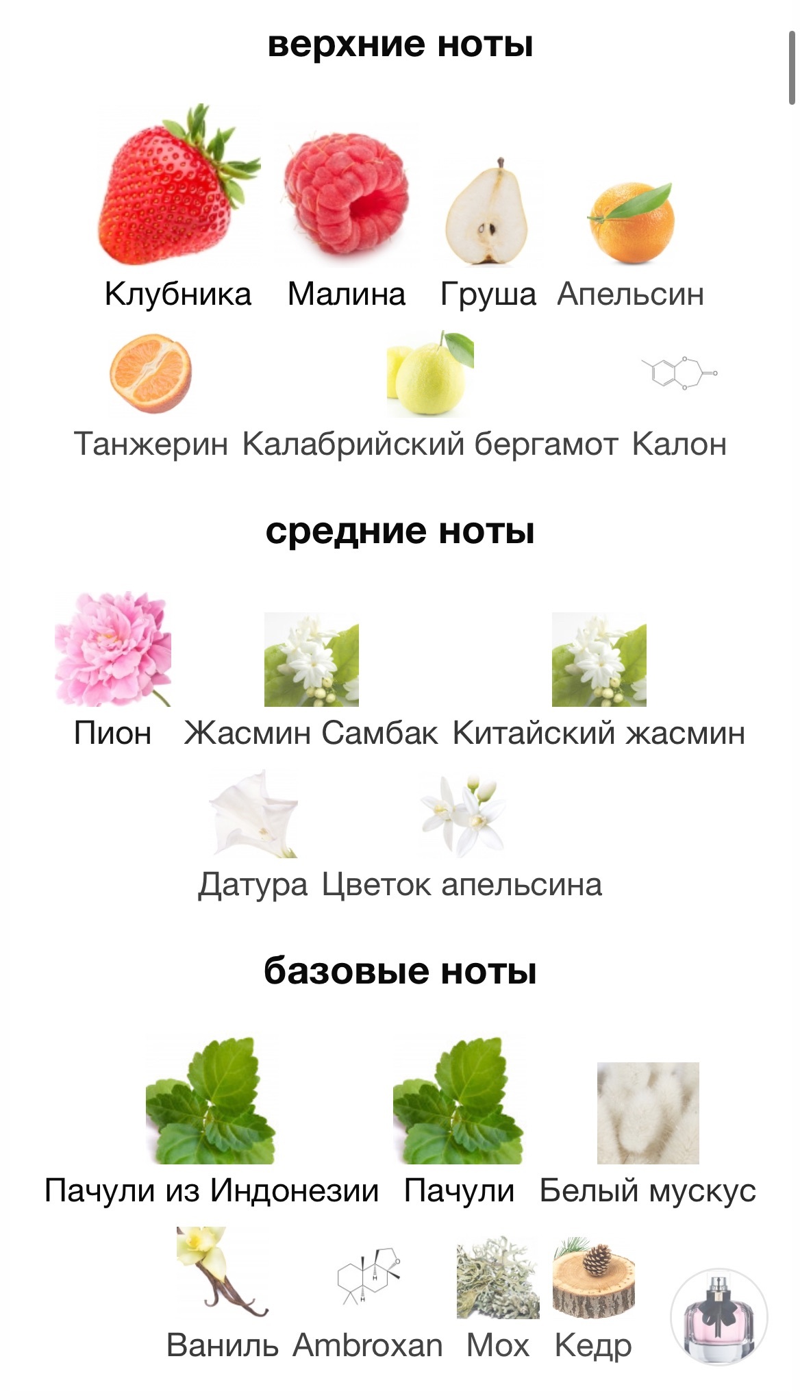 В сердце композиции раскрываются ноты жасмина, пиона и цветка апельсина, которые дополняют фруктовый букет из груши, малины и клубники. Ноты дурмана и амбры добавляют смелости и шарма.