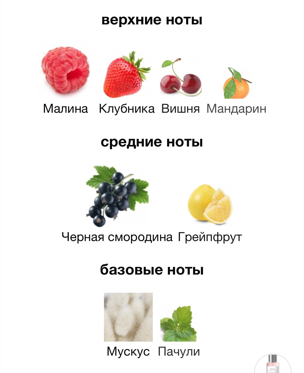 В верхнем аккорде парфюм дарит цитрусовую прохладу сладкого солнечного мандарина, тонкий запах спелой вишни и сладость душистых ягод малины и клубники.