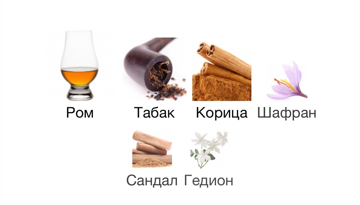 Верхние ноты: ваниль и табак, которые создают тёплый и обволакивающий аромат.